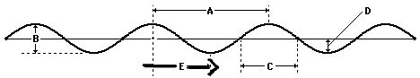 A= Crest- highest point of surface waveB= Wavelength- distance from one point of a surface wave to another which is the same part but of a the next cycleC= Rest PositionD= Trough- the lowest point of a surface waveE= Wave Height- distance from crest to trough