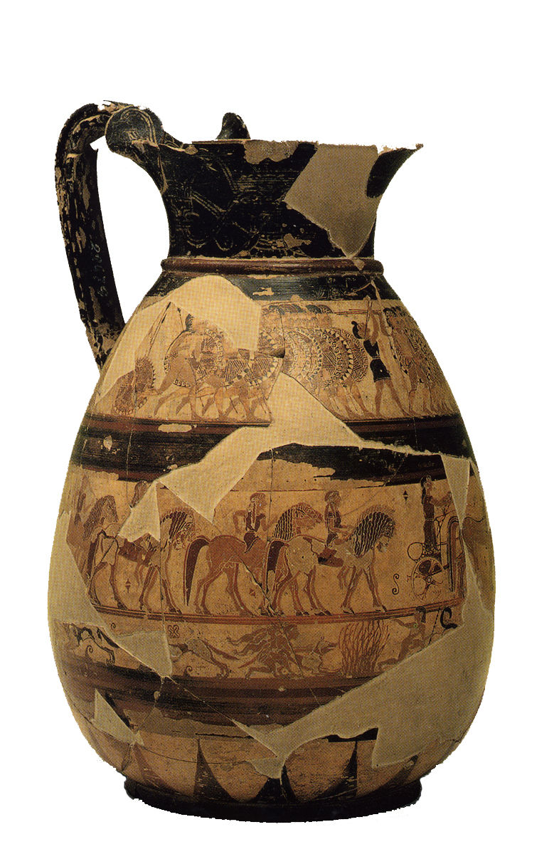 Olpe Chigi(c.640 BC) Protocorinthian Olpe Vase 26cm highDiscovered in a temple on the Chigi family estateUses black figure techniqueStructure Hoplite WarfareHorseman, Chariot, Double-bodied sphinx, Lion Hunt, Judgement of ParisHare Hunt, AnimalsRays