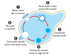 AmoebaAmoeba is a single-celled organism that lives in freshwater pools and ponds. The fresh water is less concentrated than the cell contents of amoeba. This means that amoeba must have a method of controlling osmosis or it will enlarge and burst. The osmoregulation system in amoeba consists of a contractile vacuole. The contractile vacuole works as follows:1. Water enters Amoeba due to osmosis2. Excess water enters the contractile vacuole. 3. The contractile vacuole expands. 4. The contractile vacuole touches the plasma membrane. 5. The contractile vacuole bursts to expel the water. 6. The process is repeated.