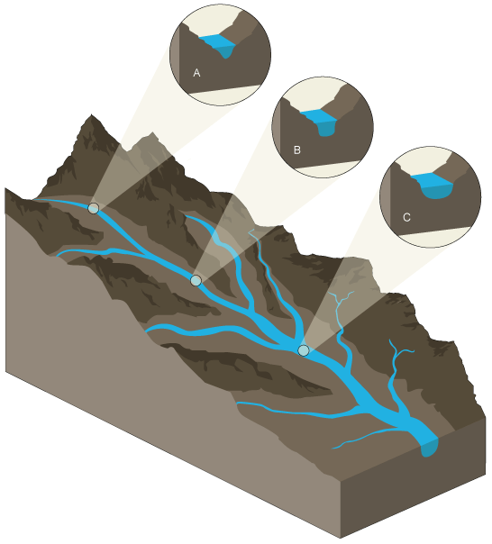 Middle - (Medium) Gentle sloping valley, wider and deeper channel.