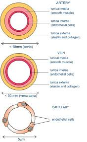 There are three main types of blood vessels, arteries, veins and capillaries. ARRTERIES USUALLY CARRY OXYGENATED BLOOD AWAY FROM THE HEART, except for the pulmonary artery which carries deoxygenated blood to the lungs. VEINS USUALLY CARRY DEOXYGENATED BLOOD BACK TO THE HEARTFROM THE TISSUES, except for the pulmonary vein in the heart which carries oxygenated blood from the lung to the left atrium. Veins have valves. Substances diffuse in and out of the blood in the capillaries.