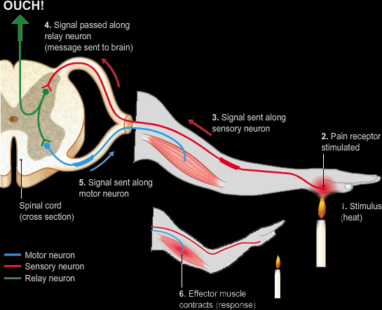 The neurones in a reflex go through the spinal cord or through an unconscious part of the brain. When a stimulus is detected by receptors, impulses are sent along a sensory neurone to the CNS. In the CNS the sensory neurone passes on the message to a relay neurone. Relay neurones relay the impulses to a motor neurone. The impulses then travel along the motor neurone to the effector the muscle then contracts to move hand away.