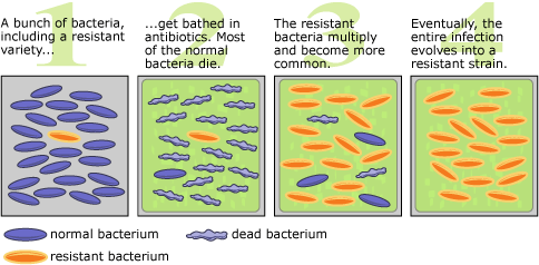 Book 1: 1 1.8 Changing Pathogens Some bacteria develop resistance to antibiotics so should use antibiotics properly, bacteria have natural mutation that means they aren't affected by the antibiotics. These mutations happen by chance producing new strains of bacteria by natural selection. More types of bacteria are becoming resistant to antibiotics making them more difficult to treat, over years antibiotics have been overused and used when they aren't really needed increases in rate at which antibiotic-resistant strains are being developed. Antibiotic-resistant strains:Normally antibiotic kills bacteria of non-resistant strains though individual resistant bacteria survive and reproduce so population of resistant bacteria increases. Antibiotics no longer used to treat non serious infections like mild throat infections which are often caused by viruses hopefully will slow down rate of development of resistant strains. The process below occurring multiple times for different antibiotics means that bacteria develops resistance to many antibiotics