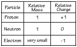 Electrons - Negative Charge - Atomic Mass 0Protons - Positive Charge - Atomic Mass +1Neutrons - No Charge - Atomic Mass +1