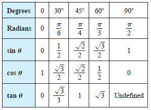 Sine, cosine and tangent are many-to-one functions (many values of x will give the same output value) for example, sine(90) = sine(450) = sine(810) ...Many-to-one functions don't have inverses, but if the domain is restricted then they can be made into one-to-one functions and then will have inverses (which are written as \(\sin^{-1}(x)\), \(\cos^{-1}(x)\) and \(\tan^{-1}(x)\) - this DOES NOT mean \(\frac{1}{sin(x)}\), \(\frac{1}{cos(x)}\) and \(\frac{1}{tan(x)}\). As with all inverse function graphs these are reflections of the original graphs in the line y=x.For inverse-sine and inverse-tangent restrict the domain to between -\(\frac{\pi}{2}\) and \(\frac{\pi}{2}\).For inverse-cosine restrict the domain to between 0 and \(\pi\).You need to be able to sketch both the trig and inverse trig graphs. Cosecant, secant and cotangent are the reciprocals of the three main trig functions above - to remember which is which look at the 3rd letter, seCant is the reciprical of Cos. \(cosec(x)=\frac{1}{sin(x)}\), \(sec(x)=\frac{1}{cos(x)}\) and \(cot(x)=\frac{1}{tan(x)}\)You need to be able to sketch these graphs aswell, using the original trig function might help...When the trig function equals 0, the reciprocal function is undefined, so will have an asymptote. When the trig function equals 1, the two functions will intersect - sec and cosec graphs also have minima at these points.There are 3 identities to learn (not in the formula book)...\(cos^2\)\(\theta\) + \(sin^2\)\(\theta\) = 11 + \(cot^2\)\(\theta\) = \(cosec^2\)\(\theta\)1 + \(tan^2\)\(\theta\) = \(sec^2\)\(\theta\)There are also addition formulae which can be used to find exact values of trig functions for an angle - these formulae are in the formula book but the table of values below is NOT. You could work this out using a right angled triangles but it's best to learn it.These addition formulae can be adapted into double angle formulae. The double angle formulae (which aren't in the Formula Book) can be used to changeexpressions in terms of sin or cos or tan of 2x back intosolveable 'x' term functions.