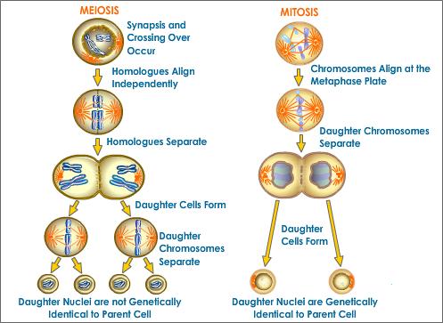 Meiosis allows for sexual reproductionIn axesual reproduction, a single parent splits to form two or more offspring. The new cells are formed by mitosis and so the offspring are identical. In sexual reproduction, two cells join to form a zygote. These cells are called gametes or sex cells. In animals, the gametes are the sperm and the egg. In flowering plants, the gametes are the male gamete nuclei and the egg and polar nuclei. The zygote will contain the normal number of chromosomes. Meiosis is essential for sexual repreduction ebcause it halves the chromosome number. This means that the normal chromosome number is restored at fertilisation. For example, In humans the normal chromosome number is 46. Meiosis halves this number to 23 in the gametes. Fertilisation restores the chromosome number back to 46 (Two gametes join, each with 23 chromosomes - 23+23=46.)