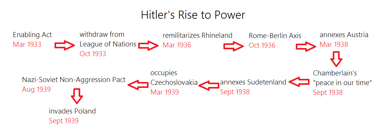 Aggression and Appeasement, 1933 - 1939 Treaty of Versailles limit German army to 100,000 - withdraw from League of Nations military draft, France, Britain, & Italy protest his actions Britain appease to avoid war - underestimate Hitler, worried about Soviet Communism Churchill disliked appeasement, but not prepared in France or Britain for war Hitler invaded Rhineland; Britain refused intervention, France couldn't act without Mussolini attacked Ethiopia, Italy join Germany in Rome-Berlin Axis Japan join for support in Manchuria Germany & Italy help Fascist Franco in Spanish Civil War Republican Spain only helped by Soviet Union Hitler threaten Austrian chancellor, Austria became part of Germany target Sudetenland, Czechoslovakia try defense, Chamberlain ceded to them no self-determination, use Czechs and Slovaks as captives refer to Slavs as Untermenschen (inferior), sign non-aggression pact Stalin distrust West, need time for industry & military, was offered territory Germans attack Poland, Britain & France declare war on Germany