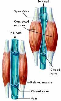 BLOOD PRESSURE AND VALVESBlood pressure is the force the blood exerts against the wall of a blood vessel (varies along the blood circuit).Blood pressure is highest in the arteries when the heart contracts. This pressure causes the artery to expand slightly. The expansion can be detected as a pulse.Pressure in veins is very low. Physical activity helps to push the blood in the veins back to the heart. This happens when the ordinary body muscles (skeletal muscles) contract. They squeeze the veins and help to return blood to the heart.People who are stationary often get weak because their muscles do not contract. Blood then collects in veins and the brain suffers a shortage of blood and oxygen.The pressure that forces the blood through the veins is low. In order to prevent backflow, and to ensure blood flows only towards the heart, veins have valves.* Valves prevent the backflow of blood.