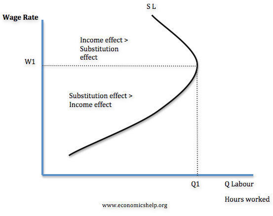With an increased wage, an individual may choose to work longer hours (due to the substitution effect) or shorter hours (due to the income effect). The individual labor supply curve slopes upwards if the substitution effect dominates, and downwards if the income effect does. However, it can become "backwards bending" if these both occur on the same graph. [see below]