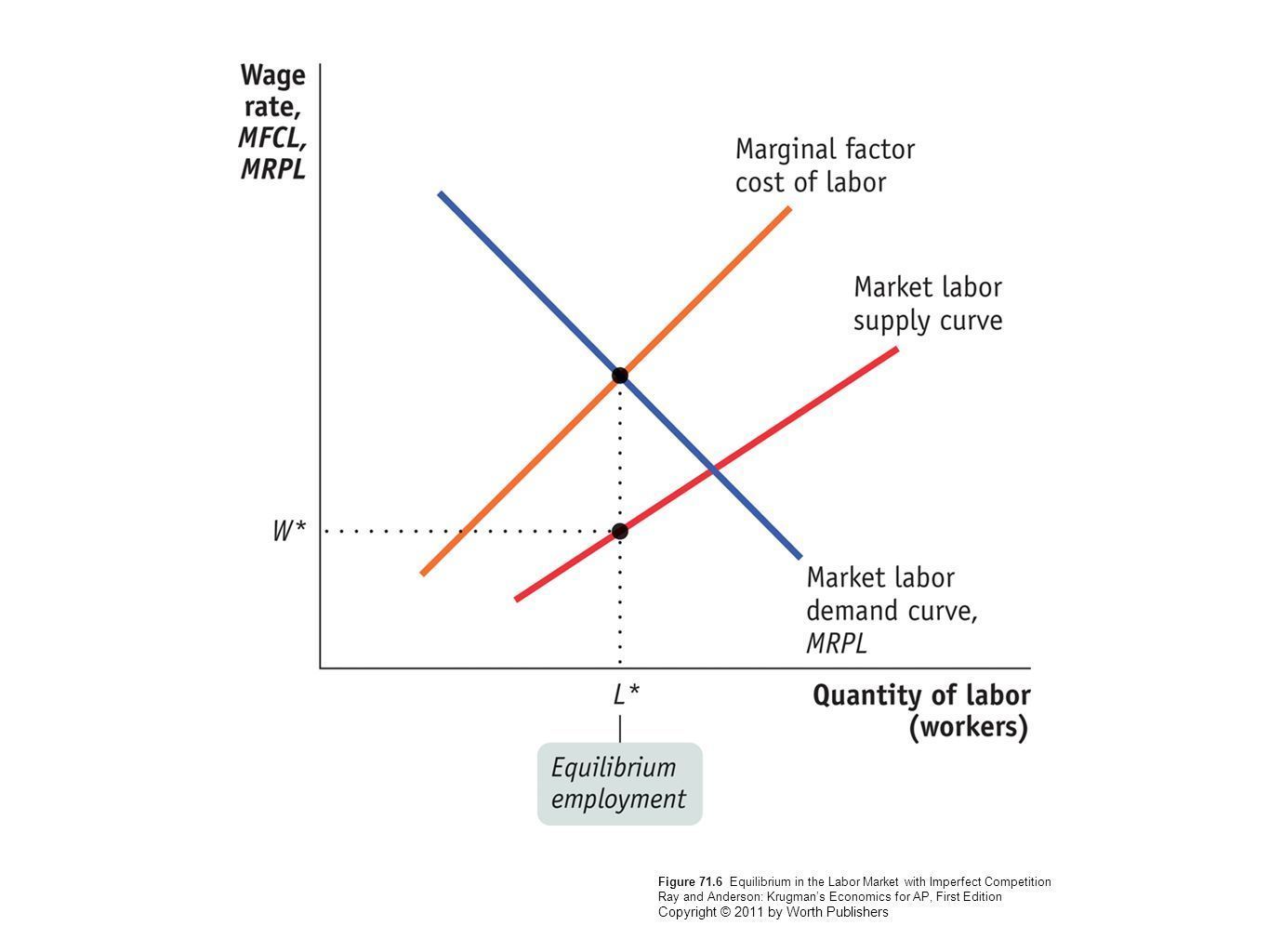 In an imperfectly competitive market, the marginal revenue product of labor (MRPL) can be found by the equation: MRPL = MPL * MRWhen the MR of the last factor unit equals the factor's cost, firms will stop employing factors of production for subsequent units. Marginal factor cost of labor (MFCL) is the cost of hiring one more unit of labor. In imperfectly competitive markets, the labor supply curve is upward-sloping and firms can affect the market wage (eg; a monopsonist, the single buyer of a factor). Firms must raise the wage to hire more workers. Firms will hire workers up to the point where: [see below graph for equilibrium wage rate]MRPL = MFCL