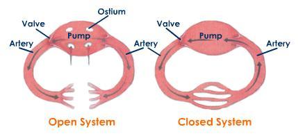 There are two forms of circulatory system :A) Open blood systemB) Closed blood systemOPEN CIRCULATORY SYSTEMThe heart pumps blood into open-ended blood vessels. The blood leaves these vessels and flows all around all of the cells of the animal's body.The blood flows back to the heart, entering it through openings in the heart walle.g. crabs, lobsters, insects, spiders, slugs, snailsCLOSED CIRCULATORY SYSTEMBlood remains in a continuous system of blood vessels, i.e. blood is always enclosed in blood vesselsExchange of material is possible through the thin capillary wallse.g. earthworms, humans