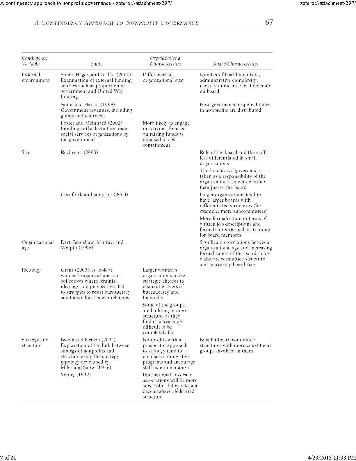 Bradshaw, P. “A Contingency Approach to Nonprofit Governance.” Nonprofit Management and Leadership 20, no. 1 (2009): 61–81.