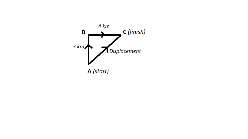 ExampleA woman walks 3 km due North (000) and then 4 km due East (090). Find her (a) distance travelled (b) displacement, i.e. how far is from where she started?Using a scale diagram (1 cm = 1 km) draw an accurate scale diagram as shown above. (a) Distance travelled = AB + BC = 7 km (b) Measuring AC - 5 cm Convert using the scale gives the magnitude of the displacement = 5 km Use a protractor to check angle BAC = 53 degrees east of north. => displacement = 5 km (053)