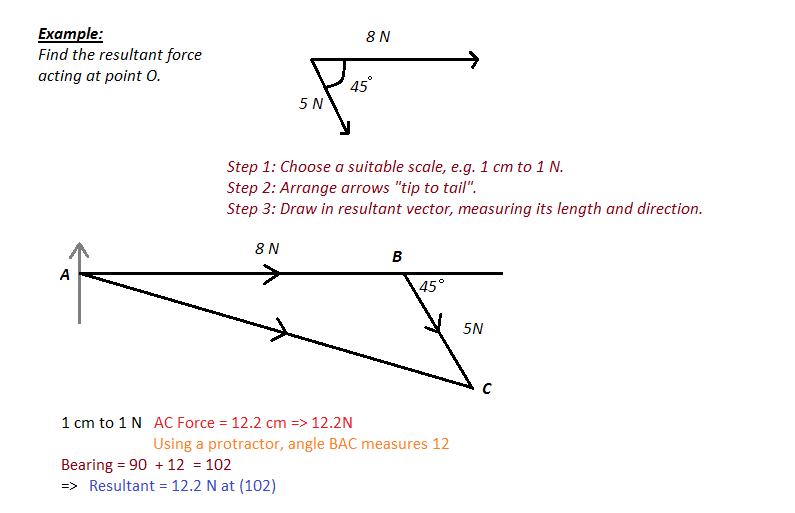 When vectors are being added, their magnitude and direction must be taken into account. This can be done using a scale diagram and adding the vectors 'tip to tail', then joining the starting and finishing points. The final sum is known as the resultant, the single vector that has the same effect as the sum of the individuals.