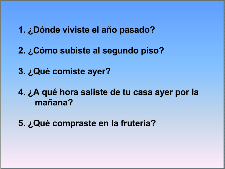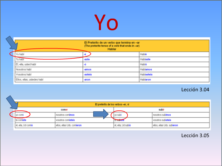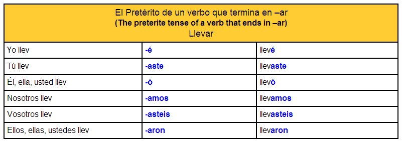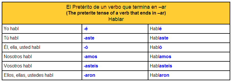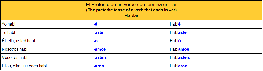 Examples:1) Anoche a medianoche, Fernando llamó por teléfono a Felipe.2) Ayer Josefina trabajó en el restaurante “Gallo Dorado.”3) Yo lavé la ropa en la máquina de lavar del hotel.4) Los alumnos llegaron a las ocho y veinticinco de la mañana.5) Nosotros hablamos con el recepcionista en la recepción.