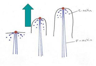 When lamellipodia or filopdia touch down they attach to the extracellular matrix through the formation of focal adhesions (focal contacts) Actin filaments connect the focal adhesion to the rest of the cytoskeleton Then, myosin motor protein pull on actin filaments to drag the cell forward Myosin II filaments doesn't stay bound to actin all the time (unusual) Myosin is one class of proteins called motor proteins Myosin 'head region' interacts with actin and binds ATP Energy release from ATP hydrolysis forces the myosin tail to move, generating force ADP is released from the myosin head and replaced by ATP at which stage the head can detach from the actin filament the head binds further down the filament Non-processive motor protein e.g. myosin II detaches completely from actin filaments at the end of the cycle will travel only short distances constantly bound and un-bound depending on hydrolysis of ATP