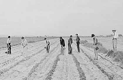 Migrant FarmersAdded to the man-made financial problems were natural ones. A series of droughts in southern mid-western states like Kansas, Oklahoma and Texas led to failed harvests and dried-up land. Farmers were forced to move off their land: they couldn't repay the bank-loans which had helped buy the farms and had to sell what they owned to pay their debts. Many economic migrants headed west to 'Golden' California, thinking there would be land going spare, but the Californians turned many back, fearing they would be over-run. The refuges had nowhere to go back to, so they set up home in huge camps in the California valleys - living in shacks of cardboard and old metal - and sought work as casual farmhands.