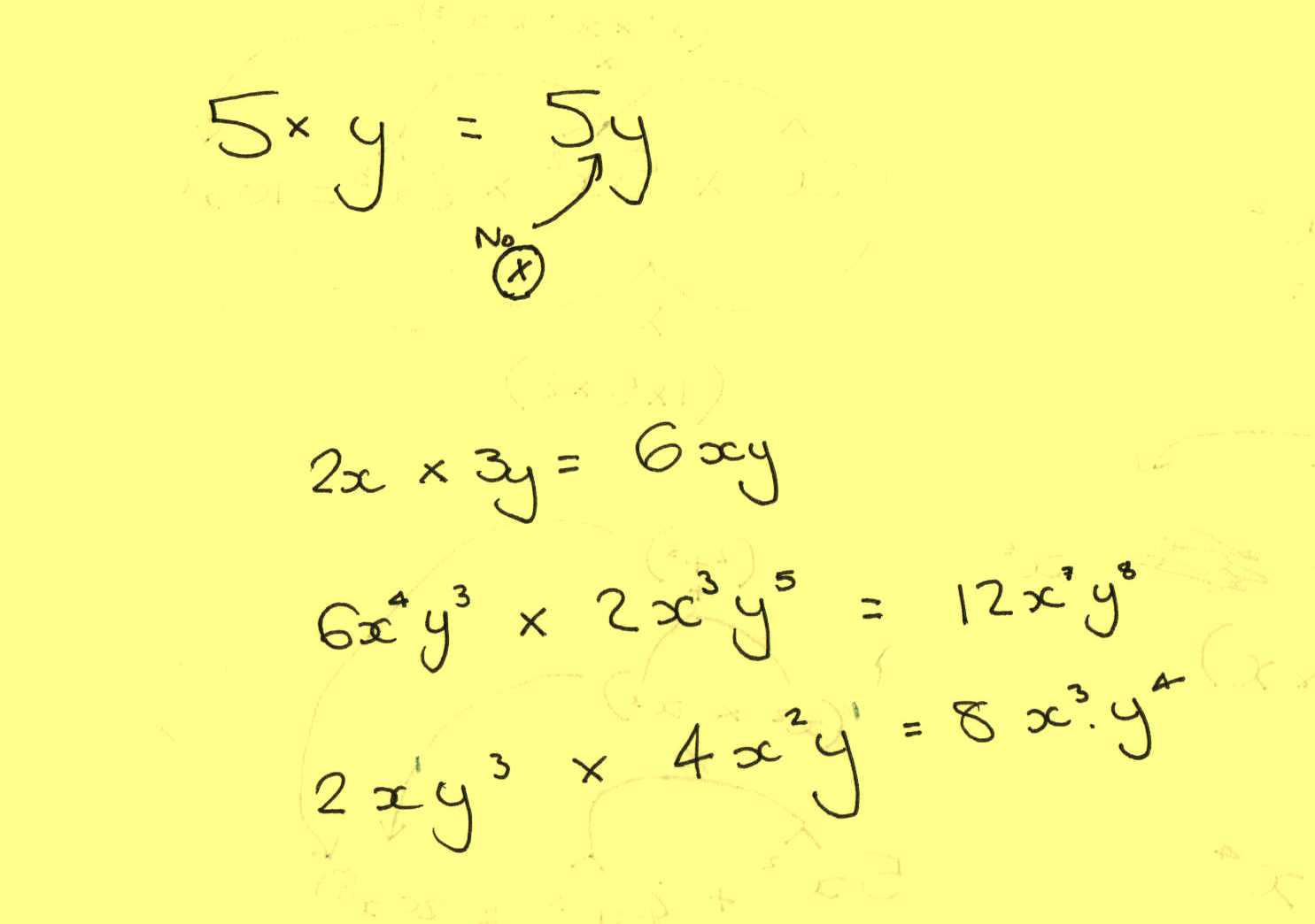 3x + 2x = 5x7x - 6x = x3xy + 2xy = 5xy ↑ ↑ ▲ Same 9xy³ + 3xy³ = 12xy³3x + 2y + 4x + 6y = 7x + 8y2x - 3y + 7x - 2y = 9x - 5y