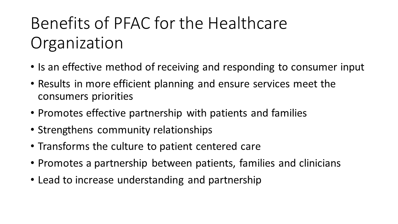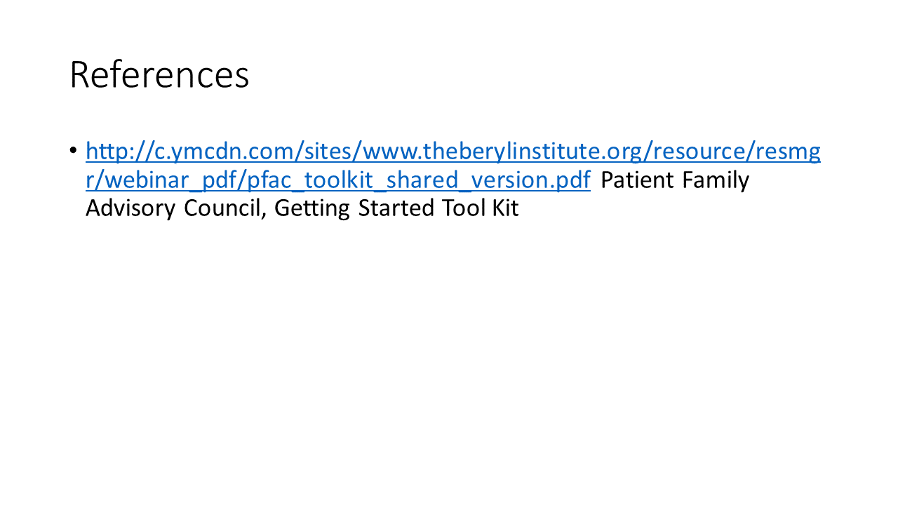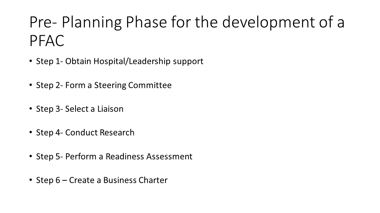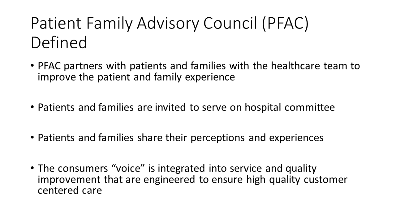 • Define, outline and describe the design and implementation of a Patient Family Advisory Council(PFAC)