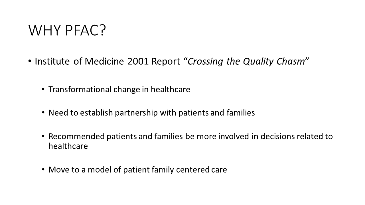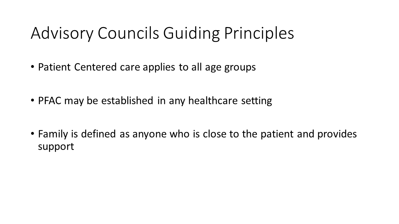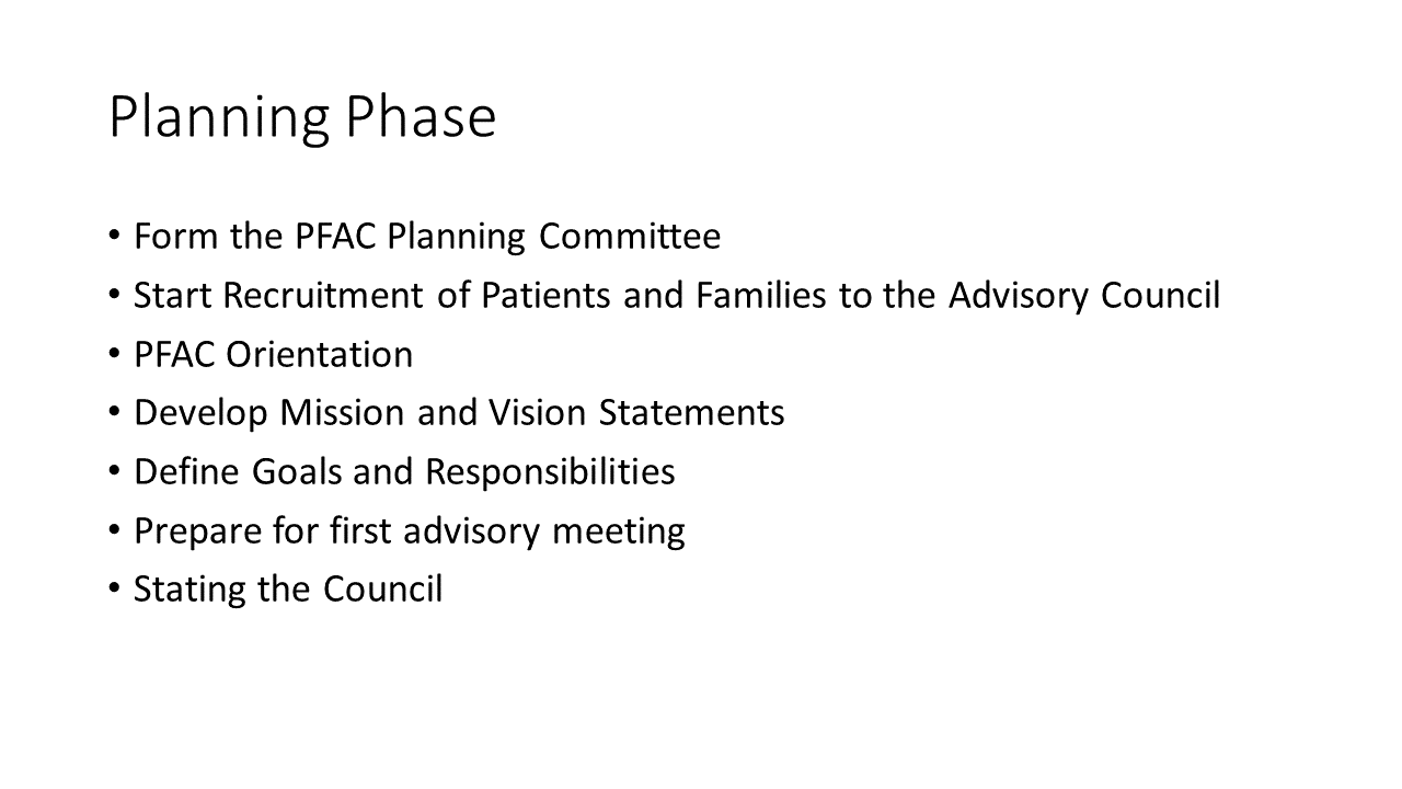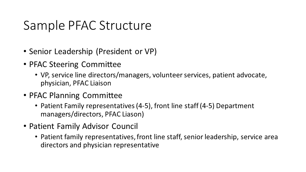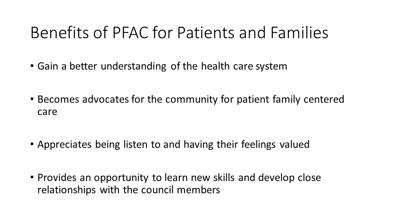• Define, outline and describe the design and implementation of a Patient Family Advisory Council(PFAC)