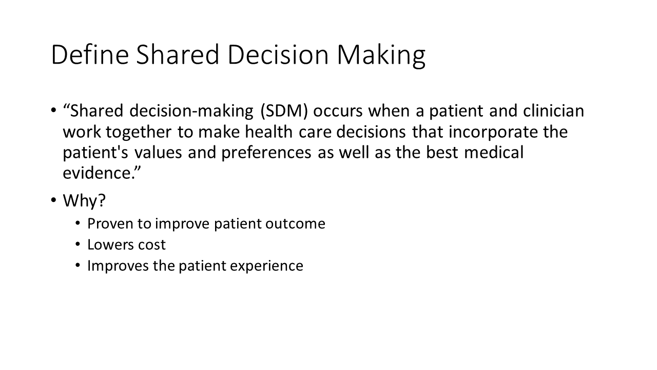 • Define shared decision making and describe its impact on experience outcomes and patients/family/resident engagement. Please note, the action items listed under Domain 1 also support your development in Domain III,