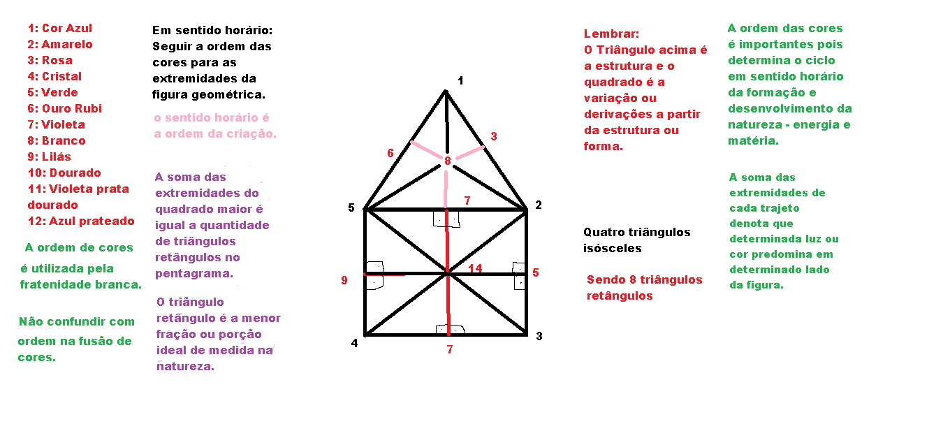 Vamos analisar o pentagrama conforme a disposição dos números e ordem de cores: Número 1 - azul criação. O iniciar da vida. Número 2 - Amarelo - O agir racional e equilibrado. Número 3 - Rosa - Realização Amorosa através de ações Número 4 - Cristal: Estabilidade, o compartilhar para a propagação do equilíbrio, formando-se egrégora de luz. Número 5 - Verde - Saúde física, mental e espiritual. A principal cor da natureza. Cor da cura e dos médicos. Significa interiorizar o aprendizado e transformar-se por inteiro. Número 6 - Rubi ouro ou Ouro Rubi - Cor responsável pela Criação da Chama Trina, o coração. O coração sente e verifica a experiencia a partir da nossa essência que é a energia amorosa que move a vida, o amor. Número 7 - Violeta - cor da transformação e transmutação. É A COR MAIS IMPORTANTE. COR DA BASE DO PENTAGRAMA. 7 significa consagração que é a finalização do ciclo e a reestrutura energética. Número 9 - LILÁS cor do registro das impressões, mudanças e transformações. Número 10 - DOURADO - CONEXÃO COM O CRIADOR. Número 11 - Violeta prata dourado cor da reconecção ou ressurreição. Número 12 - Azul prateado - a finalização da etapa necessária ao desenvolvimento do ser tanto em nível energético quanto material. Número 14 - Verde hortelã - Cor derivada a partir do verde, 5 raio. Verde Hortelã é a cor do equilíbrio mental dos seres vivos, exceto seres humanos.