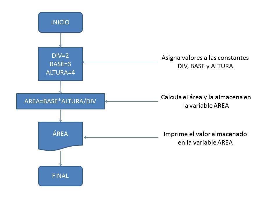 Diseñar un algoritmo para hallar el área de un triángulo rectángulo cuya Base mida 3cm, la Altura 4cm y la Hipotenusa 5cm.Análisis del Problema1. Formular el problema: ya se encuentra claramente planteado.2. Resultados esperados: el área del triángulo rectángulo.3. Datos disponibles: Base, Altura, Hipotenusa, tipo de triángulo. La incógnita es el área y todos los valores son constantes. El valor de la hipotenusa se puede omitir. 4. Determinar las restricciones: utilizar las medidas dadas.5. Procesos necesarios: guardar dos variables (Base y Altura)los valores de Base y Altura; guardar en una constante (DIV) el divisor 2; aplicar la fórmula BASE*ALTURA/DIV y guardar el resultado en la variable AREA; comunicar el resultado (AREA).Algoritmo en SeudocógicoPaso 1: InicioPaso 2: Asignar el número 2 a la constante "div"Paso 3: Asignar el número 3 a la constante "base"Paso 4: Asignar el número 4 a la constante "altura"Paso 5: Guardar en la variable "área" el resultado de base*altura/divPaso 6: Imprimir el valor de la variable "área"Paso 7: FinalAlgoritmo en Diagrama de Flujo