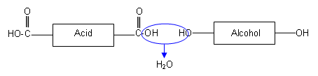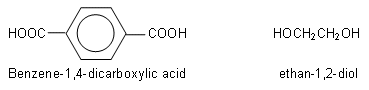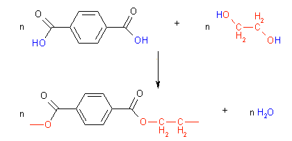PolyestersAn ester is formed and a small molecule lost when a carboxylic acid or acyl chloride reacts with an alcohol. For example:ethanoyl chloride + ethanol → ethyl ethanoate + HClThis is an example of a condensation reaction: two or more molecules combine and a small molecule is eliminated.Therefore, it follows that when a dicarboxylic acidanda diol react, the -COOH group at both ends of the dicarboxylic acid join to an -OH group and, at both ends of the diol, the -OH group joins to a -COOH group. This means that it should be possible for all the molecules to link up and create a polymer.For example: benzene-1,4-dicarboxylic acid and ethan-1,2-diol. When these compounds combine to create a polymer, water is the small molecule lost. This creates the following repeating unit:Each monomer unit links to the next by an ester group: Therefore, a polymer which consists of an ester linkage is called a polyester. The polymer used in the above example is called terylene and is used in fire-resistant clothing. It is possible to form the same polyester by combining a diacyl chloride and a diol. For example, benzene-1,4-diacyl chloride and ethan-1,2-diol. However, HCl instead of H2O is produced. The yield through polymerisation of diacyl chlorides as opposed to dicarboxylic acids is much higher. This is because the former is much more reactive and because, as HCl is a gas and therefore escapes, the reaction is harder to reverse. Therefore, before polymerisation is carried out it is common for dicarboxylic acids to be converted into diacyl chlorides by adding PCl5.