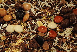 Alimento que se obtiene mezclando azúcar con dos productos derivados de la manipulación de las semillas del cacao: la masa del cacao y la manteca de cacao. A partir de esta combinación básica, se elaboran los distintos tipos de chocolate, que dependen de la proporción entre estos elementos y de su mezcla, o no, con otros productos tales como leche y frutos secos.