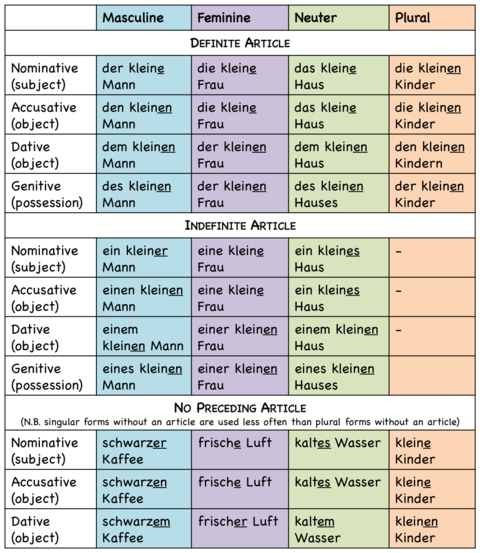 AKKUSATIVWHEN USED?Used with DIRECT OBJECT (receiver of action)Used when the nouns appears after the following PREPOSITIONSDURCH - through, GEGEN - against, UM - around, BIS - until, FUER - for, OHNE - without, ENTLANG - alongUsed with PREPOSITIONS IN MOVEMENT e.g.IN - in, AN - on, onto, AUF - on, onto, UEBER - above, UNTER - under, NEBEN - next to, VOR - in front of, HINTER - behind, ZWISCHEN - betweenUsed with EXPRESSIONS OF TIME that have NO ARTICLE e.g. Er kommt NAECHSTEN Sonntag, JEDEN Winter fahren wir Ski, DEN VIERTEN JuliARTICLES IN THE ACCUSATIVE CASEThe articles REMAIN THE SAME excluding the MASCULINEDER -> DEN EIN -> EINENADJECTIVAL ENDINGS IN THE ACCUSATIVEDER -> +en EINEN -> +en NO ART. -> +en