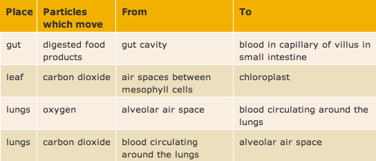 Diffusion in the body- oxygen goes in lungs- diffuses into bloodstream until respiration- carbon dioxide diffuses from bloodstream to lungs