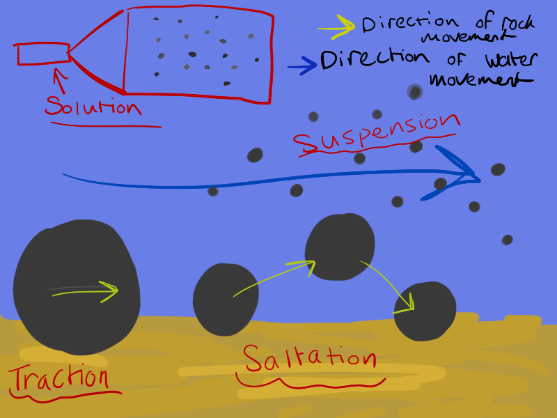 Traction: The largest boulders are pushed along the river bed by the river currentSaltation: Slightly smaller bounders are lifted off the river bed when it hasplenty of energy and are carried in the water, when the river's energy decreasesthe boulders are droppedSuspension: Smaller rocks are carried along in the river waterSolution: Dissolved particles are carried along within the water, they are invisible