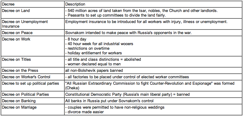 Bolsheviks took over buildings and government - Nobles, Mensheviks, liberals and the socialist revolutionaries were not happy - Bolsheviks held elections for the Constituent Assembly and the socialist revolutionaries had the most seats Bolsheviks dissolved Constituent Assembly after a day and established a "dictatorship of the proletariat"