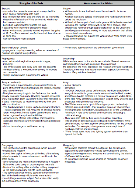 - faced threats from various armies, including the White armies of Yudenich, Denikin and Kolchak and the Green Army of Makhno. - These threats were supplemented by intervention in the form of armed forces and supplies from foreign powers such as Britain, France, the USA and Japan. - However, these formidable threats were successfully met due to the leadership of Trotsky, who set up a strong force known as the Red Army. Moreover, the murder of the tsar and his family removed the main focal point for the opponents of the Bolsheviks.- The WHITES were a very diverse group. They were united only by their hatred of the Reds. There were many rival White governments, all with different ambitious leaders, and all standing for different political solutions (some were Czarists ... some were Mensheviks some Social Revolutionaries.) They had little in common with each other, and did not form a coherent side.