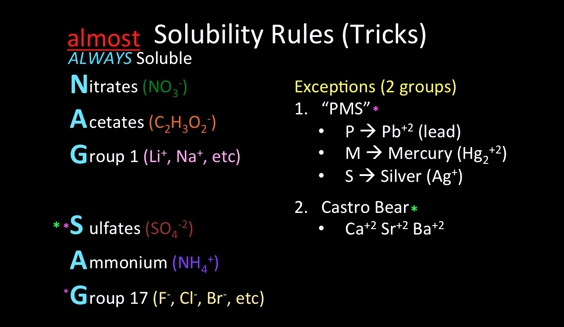 Then memorize that all common NH4 (ammonium) ionic compounds are also soluble in water. Compounds with an H+ cation (like HCl, hydrochloric acid) also tend to be soluble, as these are generally acids.