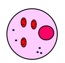 The PINK CIRCLE is the Nucleus controls all the cells functions. Contains GENETIC MATERIAL-DNA in chromosomes