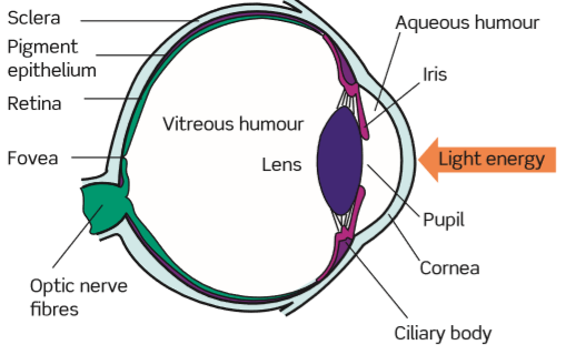 Light changes direction when it enters the cornea because it travels faster through air than our eye. Therefore, like a cars wheel on sand, it moves slower and the other wheels change direction to catch up.Ciliary muscles contract => Lens is rounder - for close visionCiliary muscles relax => Lens is stretched - for distant visionEmmetropic eye - lens right shape for eye lenghtMyopic eye - eye too long or opticts too strongHypermetropic eye - eye too short or optics too weakFrom receptors -> bipolar cells -> ganglion cells -> brain