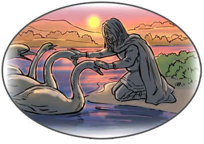 And so at the end of 300 years on lake Davra, 300 years on the sea of Moyle and another 300 years on the lake isle of Glora in Mayo, the day came when they heard the distant sound of one of the first Christian bells to ring in Ireland. They immediately followed the sound until they came to the house of a Christian called Caomhog and told him what had happened to them so long ago.They were lovingly cared for by the people of the house and people came from far and near to see the swans who could talk and sing. Then one day a princess sent her servants to try and steal the swans. But just as the servants laid hands on them the time had come for the swans to become humans again and the servants ran away terrified.Now that the swans were again human, although 900 years old, Caomhog had them baptized and the bells rang out at their Christening. Soon afterwards, when they had died of old age, Caomhog dreamt on the very same night that he saw four beautiful children - a boy, his sister and two twin brothers flying out over the lake then straight up to heaven and he knew they really were the children of Lir.