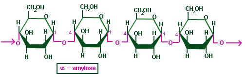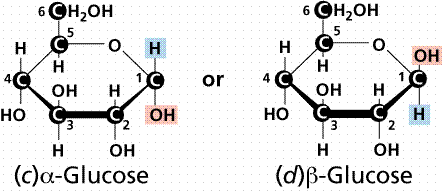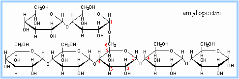 Glucose can either be made up of alpha glucose or beta glucose. With alpha glucose, the hydroxyl groups on the 1 and 4 carbons are below whereas in beta glucose, one of the hydroxyl groups has switched sides, so one hydroxyl group is at the top and another is on the bottom. Starch is an insoluble store of glucose. A typical starch grain contains 70-80% amylopectin, the rest is amylose (20-30%). If it were soluble then it would interfere with osmosis. Its only found in plant cells and the animal equivalent is glycogen - the storage polymer (glycogen is also found in bacteria and fungi). Glycogen is a much tighter spiral structure and has a lot more 1,6 glycosidic bonds. We store glycogen as its a compact structure with lots of branches making for a higher number of glucose sub units. The numerous side branches means that it can be rapidly hydrolysed to glucose.