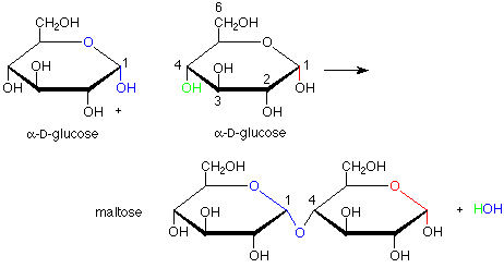 When alpha glucose and alpha glucose react together, they form maltose. The bond in maltose is known as a 1,4 glycosidic bond because it forms between carbon 1 on one monosaccharide and carbon 4 on the other monosaccharide.