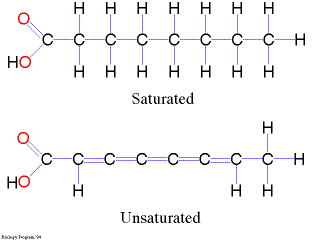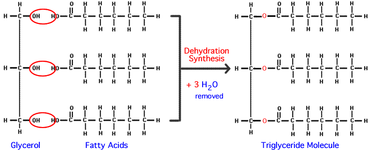 The glycerol molecule forms 3 ester bonds between the 3 fatty acid tails, after a condensation reaction occurs and water is removed. The ester bond is between the oxygen from the glycerol bonded to the carbon on the fatty acid and the other oxygen double bonded to the oxygen. This forms a type of lipid known as a triglyceride and is the most common lipid we eat.Saturated FatsWhen a fatty acid chain contains the maximum number of hydrogen's, they are saturated. In saturated fats, the hydrocarbon chain is long and straight. Animal fats such as meat and dairy are saturated fat sources. There are no carbon to carbon double bonds so the chain is straight and these chains can pack closely together. The strong intermolecular bonds between triglycerides made of saturated fatty acids result in fats that are solid at room temperature.Unsaturated FatsMonounsaturated fats have one double bond between 2 of the carbon atoms in each fatty acid chain. Polyunsaturated fats have a large number of double bonds. This double bond causes a kink in the chain and prevent the unsaturated chains packing close together. This increase in distance between the molecules, weakens the intermolecular forces between unsaturated triglycerides and thus causes oils that are liquid at room temperature. Olive oil is high in monounsaturated fats and vegetable oils, nuts and fish are good sources of polyunsaturated fats.Unsaturated fats can be made solid at room temperature by adding hydrogen to the double bond, making them saturated. These hydrogenated - or trans-fats are produced by the food industry and used in processed food. Trans-fats occur naturally at low levels in meat and dairy products.