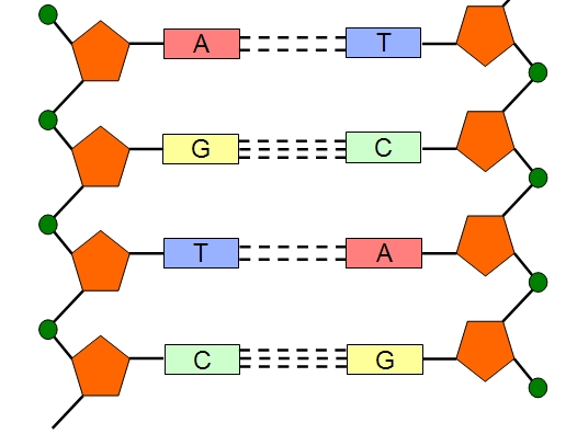 Remember ADENINE must bond with THYMINE (DNA) or URACIL (RNA) and GUANINE must bond with CYTOSINE (triple bond). This is the complementary base pairing. In DNA, this complementary base pairing causes two strands to line up parallel to one another, with the bases on the inside - bonded to one another. The weak hydrogen bonds keep the strands together. Bonding also takes place up the strand, causing it to spiral into an alpha helix.