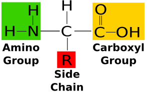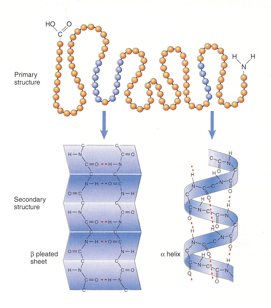 The Different Structure of Amino Acids: Primary Structure - This is like a string of beads and is the amino acid in its most simplest form. It is just the order or sequence of amino acids, the polypeptide chain Secondary Structure; Alpha Helix - This is the primary structure but it has been folded into its shape - alpha helix is held in place by hydrogen bonds between every N-H group and the oxygen of a C=O group in the next turn of the helix, 4 amino acids down the chain