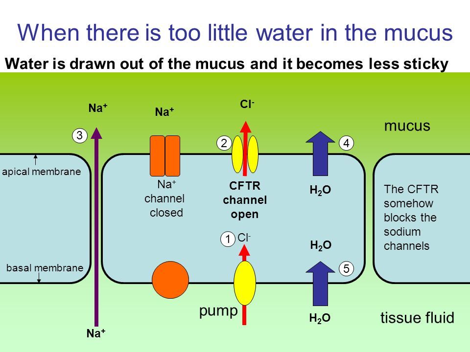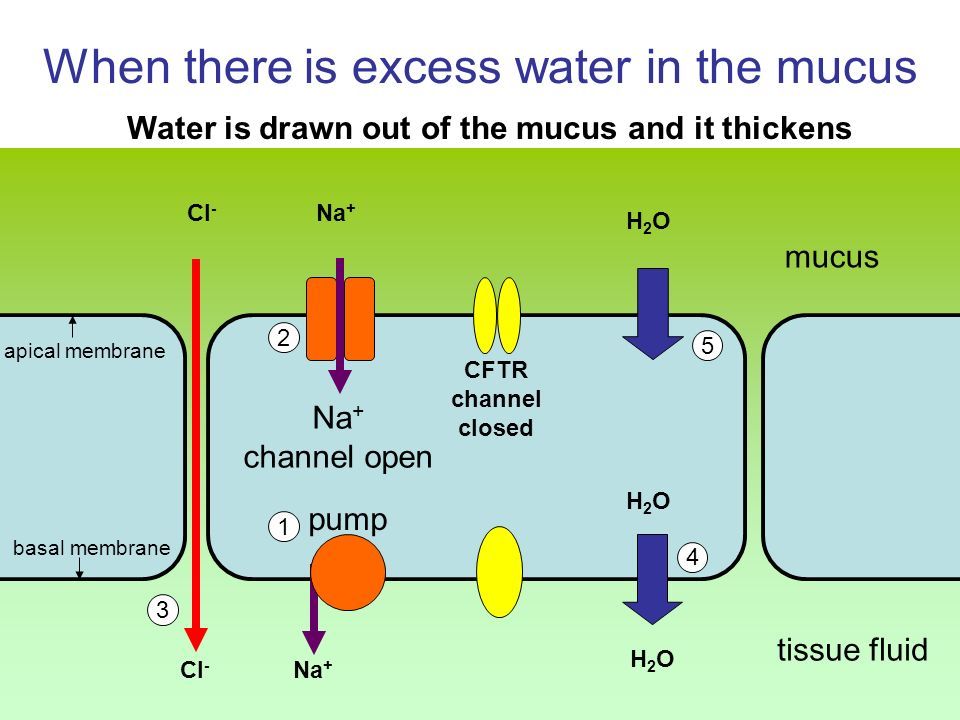 When there is too little water in the mucus, chloride ions are transported across the basal membrane into the epithelial cell. This creates a concentration gradient across the apical membrane, with the concentration of chloride ions being higher inside the cell than out. The CFTR channel opens and chloride ions diffuse out of the cell, down the concentration gradient, into the mucus. When the CFTR channel opens, the sodium ion channels close in the apical membrane. The build up of Cl- ions in the mucus creates an electrical gradient, into the mucus and the tissue fluid. Sodium ions diffuse out of the tissue fluid. down the electrical gradient into the mucus. The Na+ and Cl- in the mucus draws water out of the cells by osmosis until the solutions on either side of the apical membrane have the same concentration of free water molecules. The movement of water prevents the mucus that lines the airways from becoming too viscous.