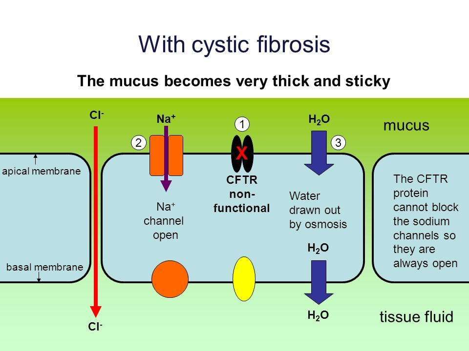 Cystic Fibrosis or CF is caused by a gene mutation which makes the CFTR protein. CFTR is coded for by the gene. It can occur in two forms, F and f. F is the normal allele which is dominant f is the mutated CFTR allele which is recessive Cystic fibrosis is what's known as a monohybrid inheritance which means that there is only one gene mutation. Other examples og=f monohybrid inheritance is: Albinism Achondroplasia Huntington's Disease There are some relationships between genetic diseases and other diseases. For example, thalassemia affects the production of haemoglobin and is caused by recessive alleles of a gene and mutations affect this gene. Someone whose homozygous for these recessive alleles either makes no haemoglobin or useless haemoglobin. However people who are carriers (heterozygous for this disease) show no symptoms but they do have protection against malaria. What does the CFTR Protein do?Surrounding the ciliated epithelial cells is a fluid called extracellular fluid. Within this fluid there are chloride ions and sodium ions. The water content regulation in mucus, controlled by osmosis effects the viscosity and the sodium and chloride ions are controlled by the CFTR protein. If the CFTR protein mutates, then this effects the movement of chloride and sodium ions and thus the viscosity of the mucus.