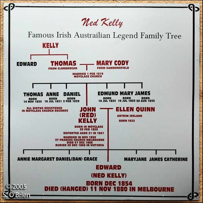 Kelly, Edward (Ned) (1855–1880) Edward (Ned) Kelly (1855-1880), bushranger, was born in June 1855 at Beveridge, Victoria, the eldest son of John (Red) Kelly and his wife Ellen, née Quinn. His father was born in Tipperary, Ireland, in 1820 and sentenced in 1841 to seven years' transportation for stealing two pigs. He arrived in Van Diemen's Land in 1842. When his sentence expired in 1848 he went to the Port Phillip District, where on 18 November 1850 he married Ellen, the eighteen-year-old daughter of James and Mary Quinn; they had five daughters and three sons. Ned attended school at Avenel until his father died on 27 December 1866. Left indigent, the widow and children moved to a hut at Eleven Mile Creek, about half-way between Greta and Glenrowan in northern Victoria, where James Quinn had taken up a cattle run of 25,000 acres (10,117 ha) of poor country in 1862. Well known in the district, the Quinns and two Lloyd brothers, who had married into the family, were suspected by the police in connection with thefts of horses and cattle. In 1869 Ned was arrested for alleged assault on a Chinaman and held for ten days on remand but the charge was dismissed. Next year he was arrested and held in custody for seven weeks as a suspected accomplice of the bushranger, Harry Power, but again the charge was dismissed.