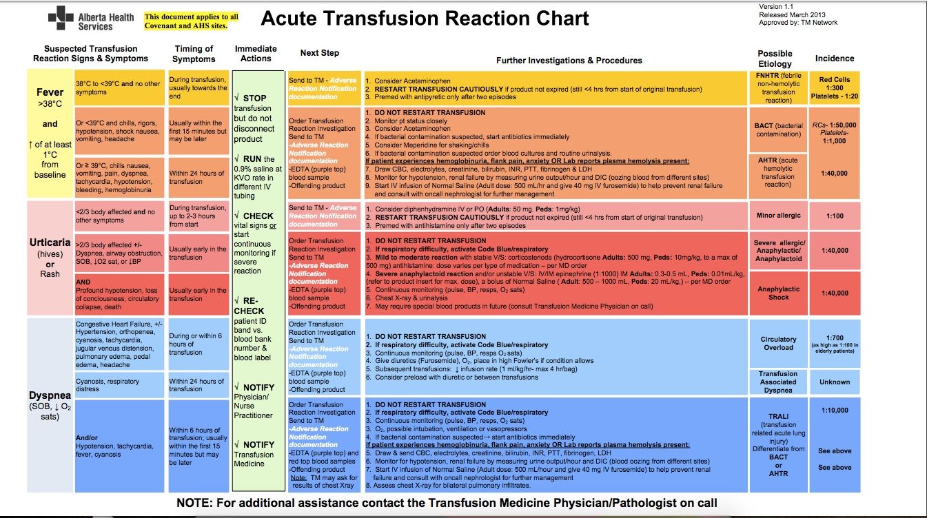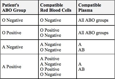 Blood products used and the conditions they treat: Red Blood CellsSymptomatic anemiaHemoglobin level of 7–8 g/dL in stable, hospitalized patientsHemoglobin ≤8 g/dL in the presence of clinical symptoms for patients with cardiovascular disease PlasmaReplacement of clotting factors in patients with a demonstrated deficiency or for single-factor deficiency when concentrate not availableCorrect coagulation deficienciesBefore an invasive procedureBurn victims PlateletsAcute thrombocytopenia:Platelet count <10,000/μLStable patients with chronic thrombocytopenia: 5000/μLFever or recent hemorrhage (with bleeding controlled): 10,000/μLPatients with coagulopathy, on heparin, or with anatomic lesion likely to bleed: 20,000/μL Procedure for blood administration: Confirm consent Verify the order assess for 18-20 gauge catheter of needle inserted into vein assess baseline vital signs, oxygen saturation and lung sounds assess blood type and check label prior to administration perform double check of blood product/patient monitor transfusion of blood/components and monitor for complications identify and use appropriate infusion tubing to deliver blood/components with. 170 to 260 micron filter; tubing is good for 8 hours and as many infusions as can be done in that time sideline solution container of .9% normal saline. The use of dextrose in water or hypotonic solutions can cause RBC hemolysis as a result of cell swelling. Lactated Ringer’s solution is not recommended because it contains enough ionized calcium to overcome the anticoagulant effect of CPDA-1 and allows small clots to develop. transfuse blood/blood components at appropriate ratesVitals taken in first 15 minutes1ml/min for the first 15 minutes, look for anaphykaxis, do not leave Transfusion must be complete within 4 hours dispose of blood bag and tubing properly. (biohazard) A note on cross-match: Lab comes to draw, need two people to identify patient. Cross match is good for 72 hours, but can be extended if there’s no transfusion in the first 72 hours. Cross match takes 30 minutes for someone who hasn’t gotten a transfusion before. 10 hours for Denane’s dad. The more transfusion a pt has, the longer it takes to cross match because they make more and more antibodiesType O: no ABO Antigens on Red Cells; anti-A and anti-B Antibodies in Plasma Type A: A antigens on red cells, anti-B antibodies in plasmaType B: B antigens on red cells; anti-A antibodies in plasmaType AB: A+B antigens on red cells; no antibodies in plasma
