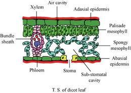 - Xylem- Upper (Adaxial) epidermis- Palisade mesophyll- Spongy mesophyll- Lower (Abaxial) mesophyll- Phloem- Stomates- Cuticle- Cambium- Air holes- Palisade cells- Midrib/ Main vein
