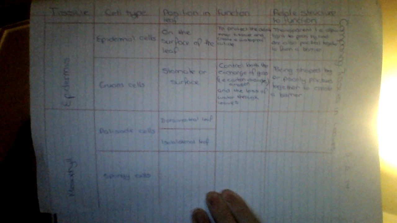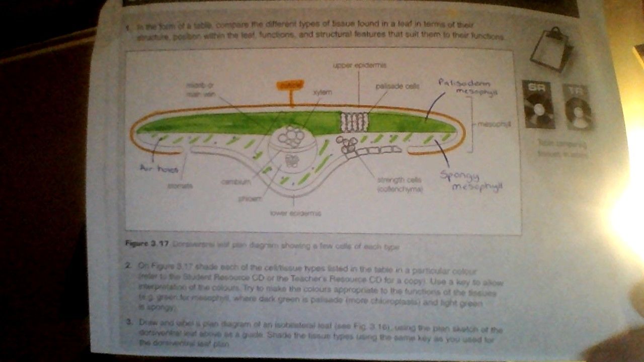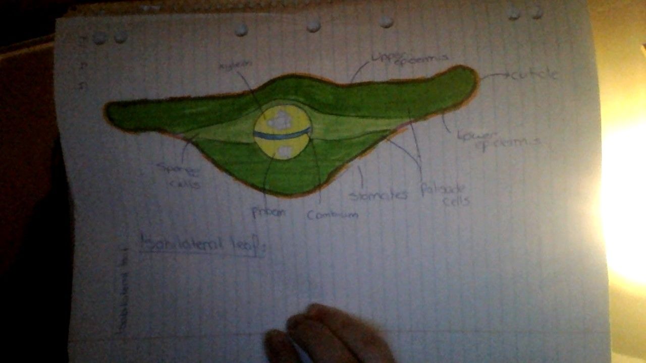 - Xylem- Upper Epidermis- Cuticle- Lower epidermis- Palisade cells (2x layers, one upper and one lower)- Stomates- Combium- Phloem- Spongy cells (1x layer, in the middle)