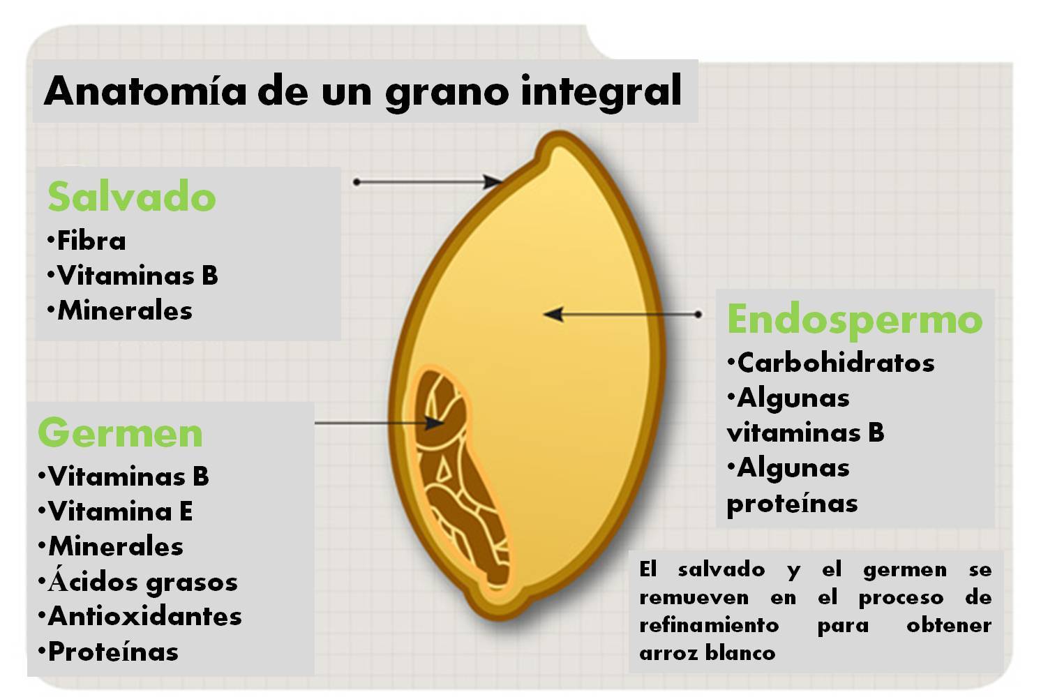 Aquí podéis ver la estructura de un grano de arroz integral. Cuando lo tomamos refinado, que es lo que hacemos siempre, eliminamos tanto el SALVADO como el GERMEN. Esto quiere decir que ELIMINAMOS TODA LA FIBRA, TODOS LOS MINERALES Y CASI TODAS LAS VITAMINAS Y PROTEÍNAS.Esto quiere decir que estamos tomando CALORÍAS VACÍAS, una gran cantidad de energía que no necesitamos (aunque tengamos hambre) sin nada fibra ni minerales ni vitaminas. Podéis aprender más sobre ellas AQUÍ.